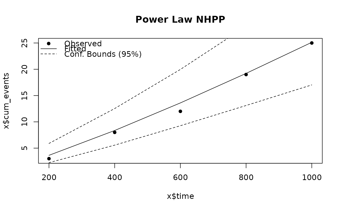 Fits a parametric NHPP model to recurrent event data from repairable systems. Supported models include the Power Law process and the Log-Linear process. The Power Law model can also be fit as a piecewise (segmented) model with automatic change point detection or user-specified breakpoints.