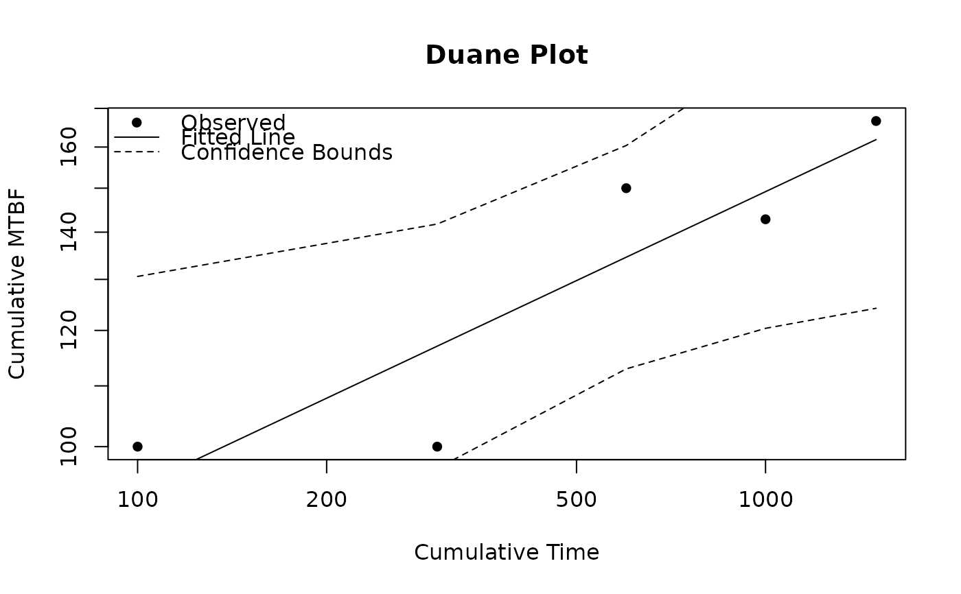 Generates a Duane plot (log-log or linear scale) with fitted regression line and optional confidence bounds.
