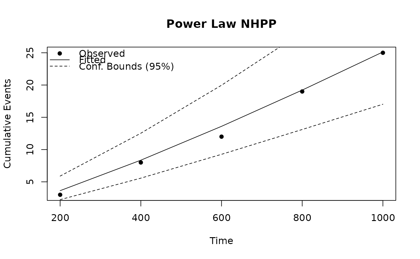 Plots observed cumulative events with the fitted NHPP model and optional confidence bounds.